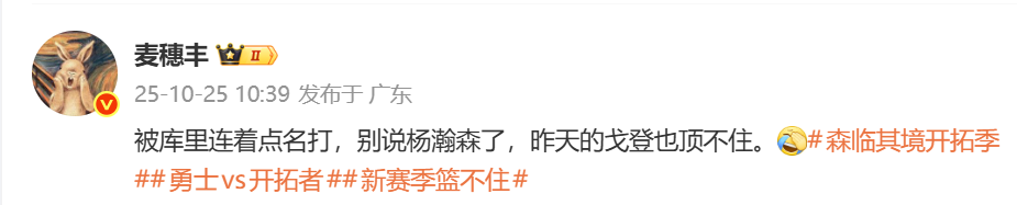 媒体人@麦穗丰发文写道:“被库里连着点名打,别说杨瀚森了,昨天的戈登也顶不住。”