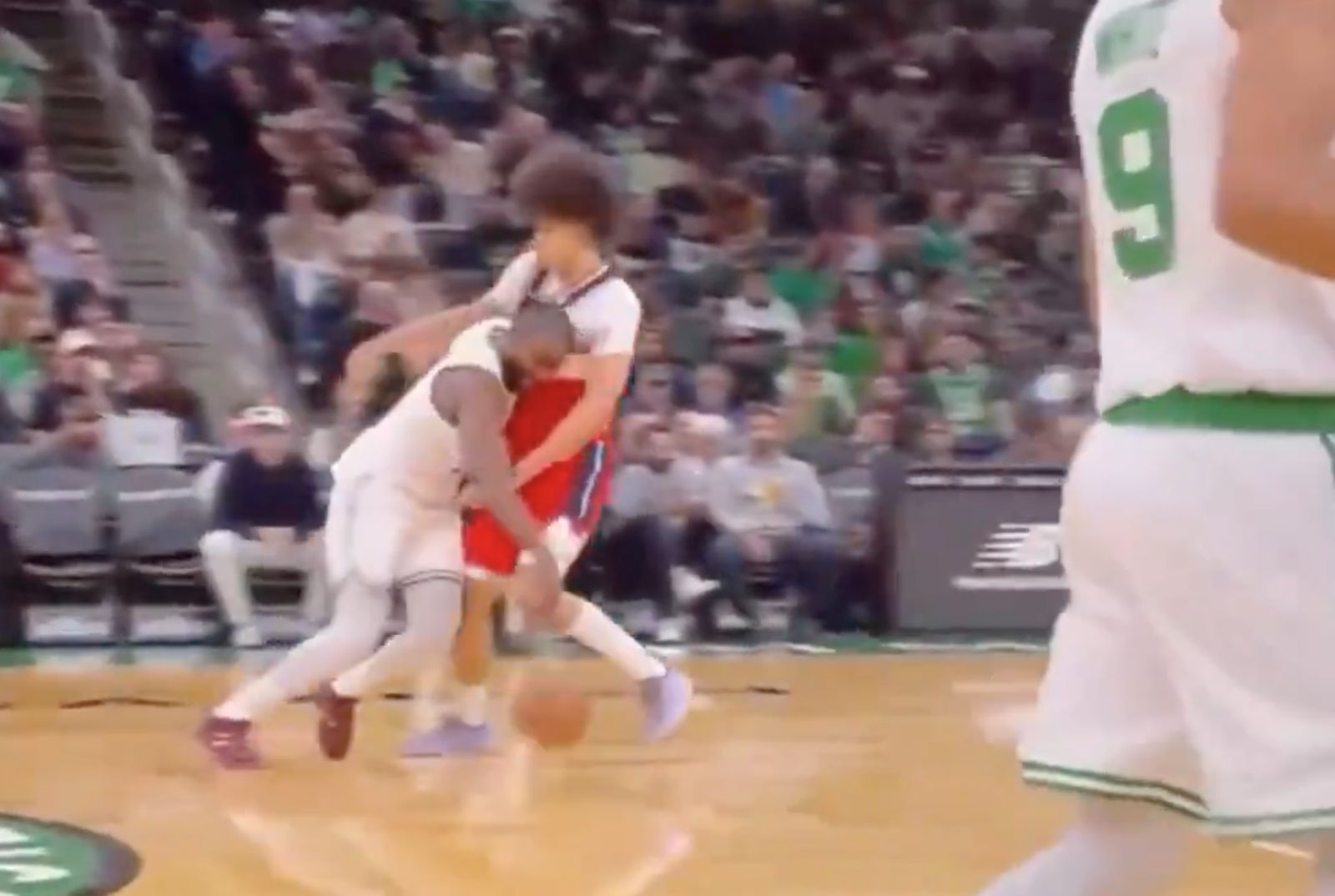 尴尬!布朗本场撞翻乔治的回合中,发际线粉蹭到了后者衣服上