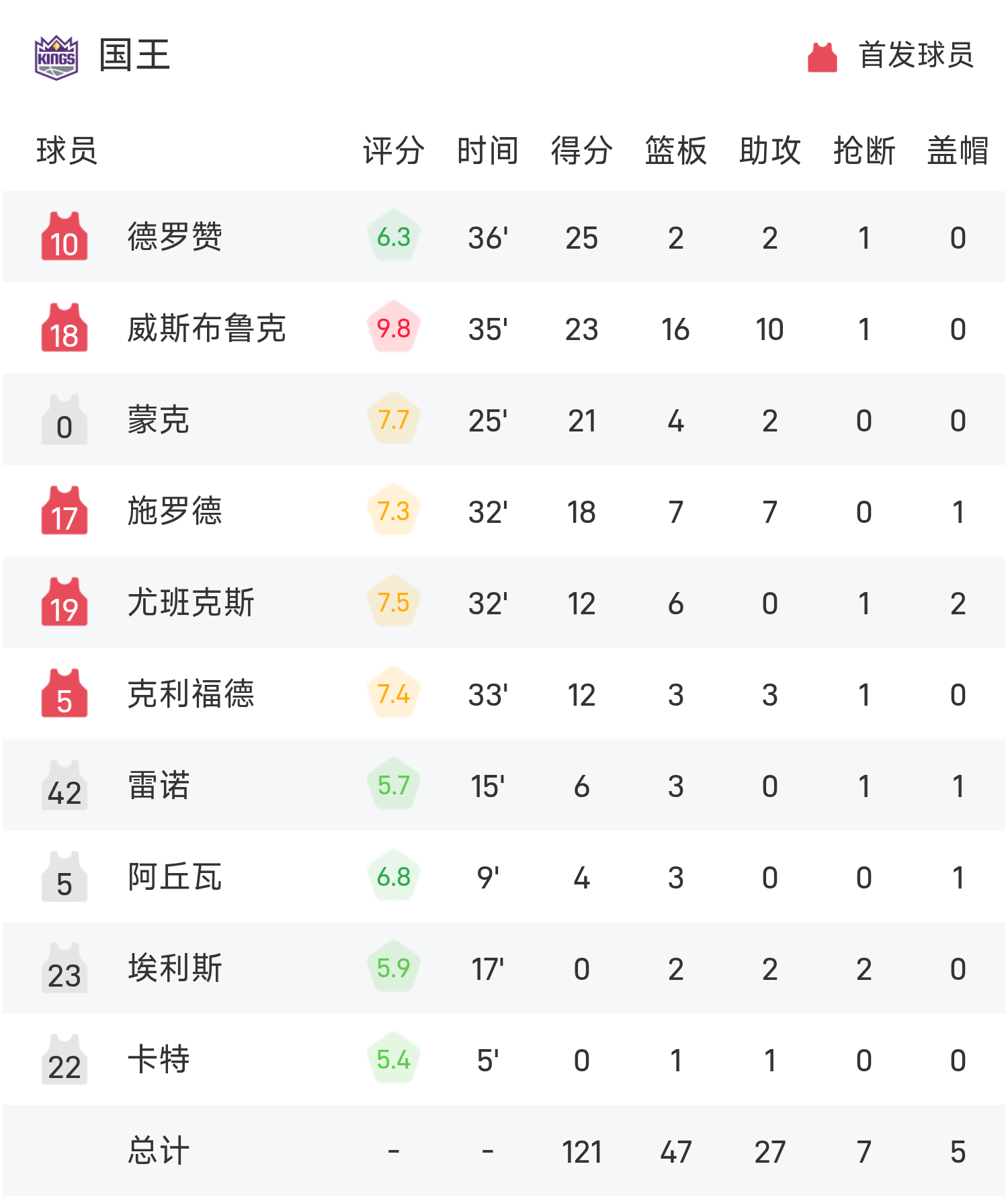 德罗赞得到25分2板2助率队取胜,理查德空砍全场最高的30分7板3助。