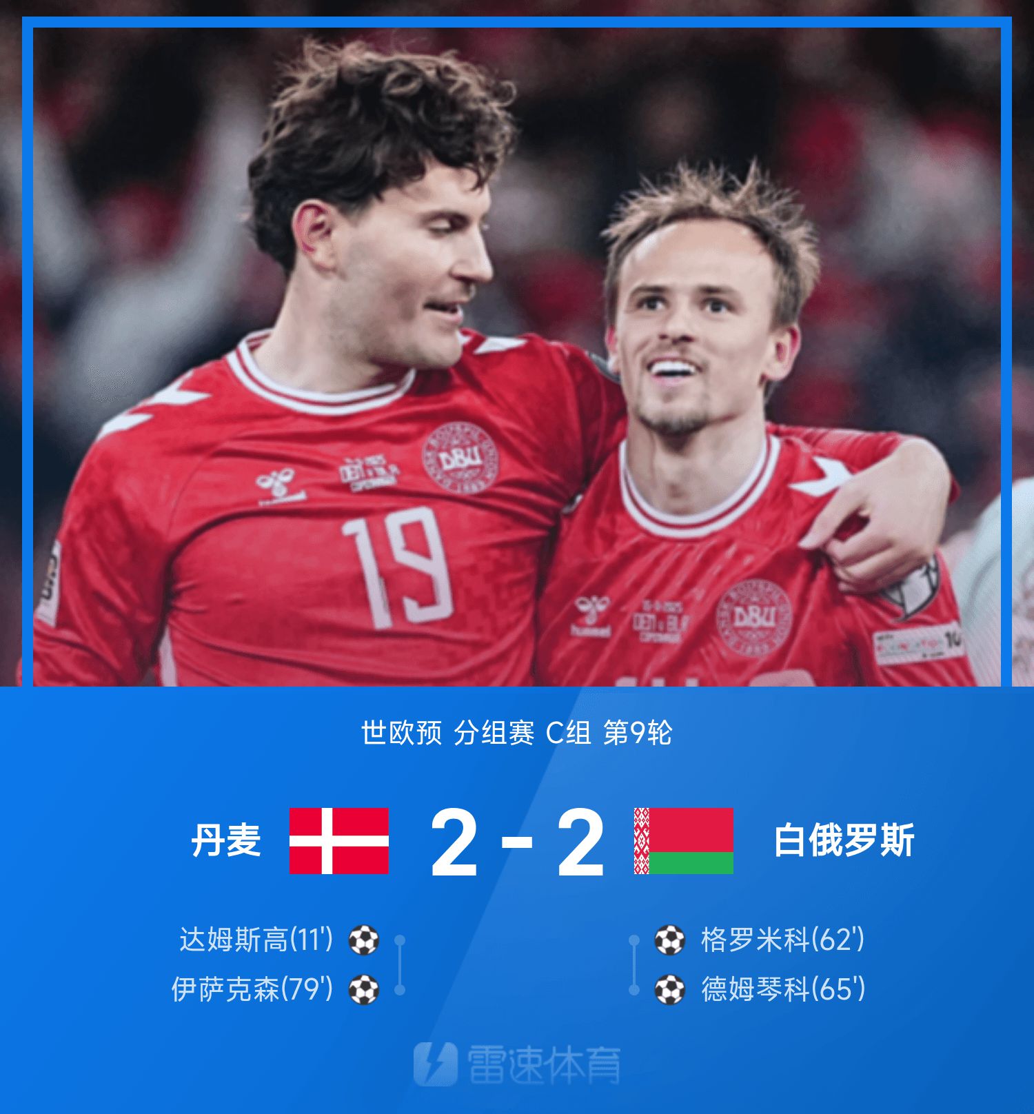 6686体育app11月16日讯 26赛季世欧预分组赛C组第9轮,丹麦对阵白俄罗斯。第11分钟,达姆斯高三秒区外轰出超级世界波,丹麦取得梦幻开局。下半时风云突变,白俄罗斯在第62分钟和第65分钟运用格罗米科的传射建功,瞬间将赛果分逆转局为2-1。第79分钟,多尔古传禁区,伊萨克森爆射破门,两队再度回到同一出发线。最终丹麦在主队场以2-2战平白俄罗斯,由于同组的苏格兰作客不敌希腊,丹麦仍然占据直接晋级世杯赛总决赛圈的优势位置。