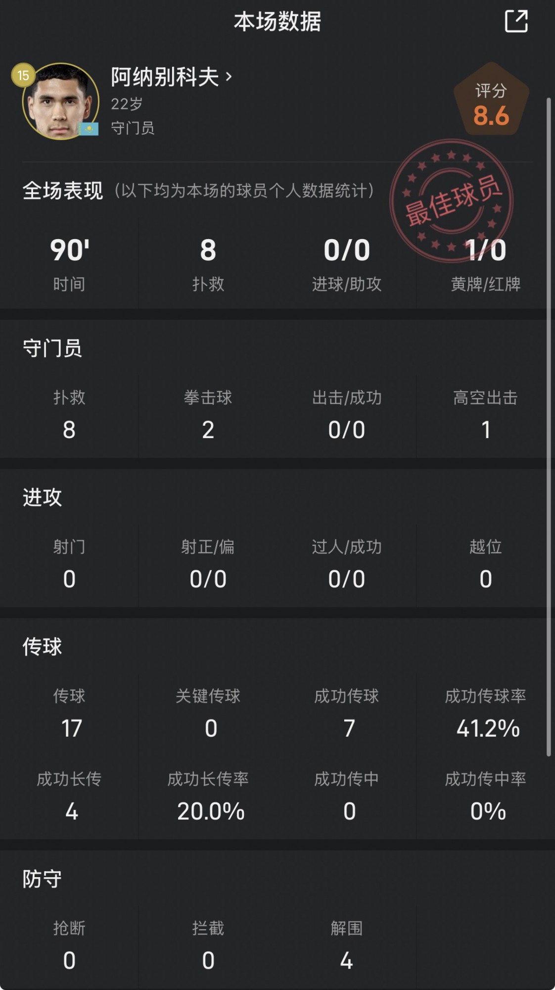 哈萨克斯坦守门员战比利时数据:贡献8救球+极限阻止队友乌龙