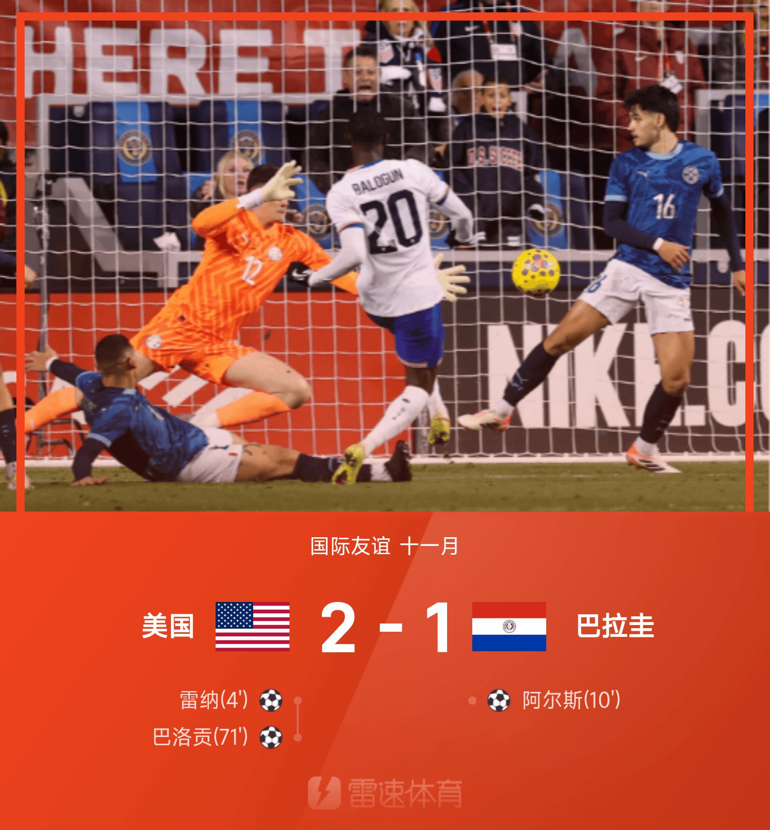 6686体育app11月16日讯 国际友谊赛迎来一场对决,美国主队场对阵巴拉圭。美国队方面,巴洛贡、雷纳分别破门建功,而巴拉圭方面阿尔斯破门难救主,最终美国2-1击败巴拉圭。
