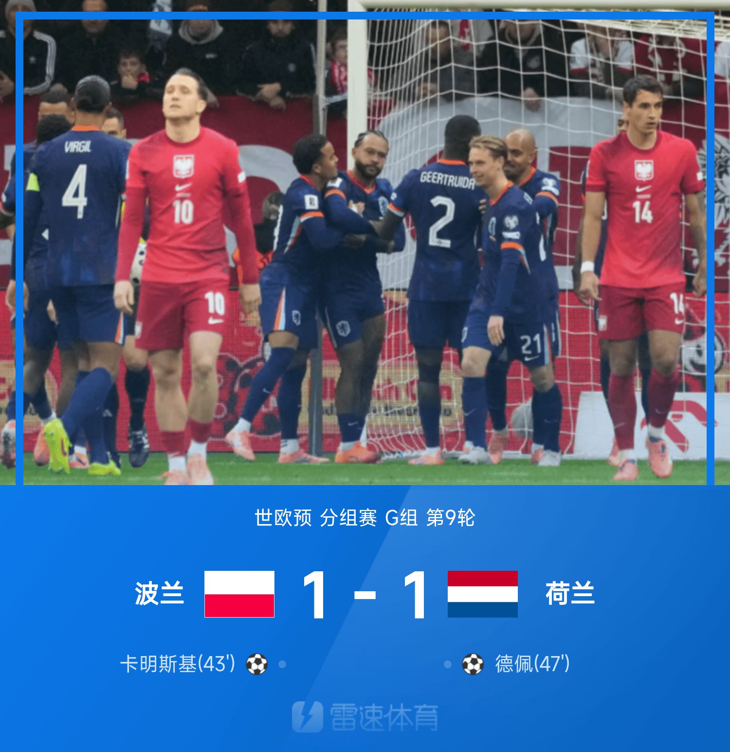 世欧预战报:德佩建功,荷兰1-1客平波兰,出线形势大好
