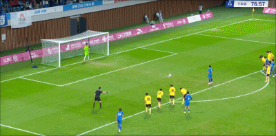 4’钟文操刀主罚三秒区前沿自由球,击中人墙后稍稍偏出