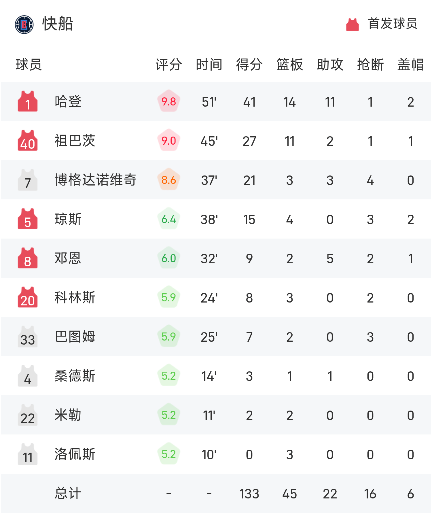 6686体育app11月15日讯 25/26赛季NBA 常规赛 NBA杯分组赛,独行侠对阵快船。双方全场战罢,独行侠127-133不敌快船。哈登砍下全场最高的41分14板11助,率领快船胜利取胜。