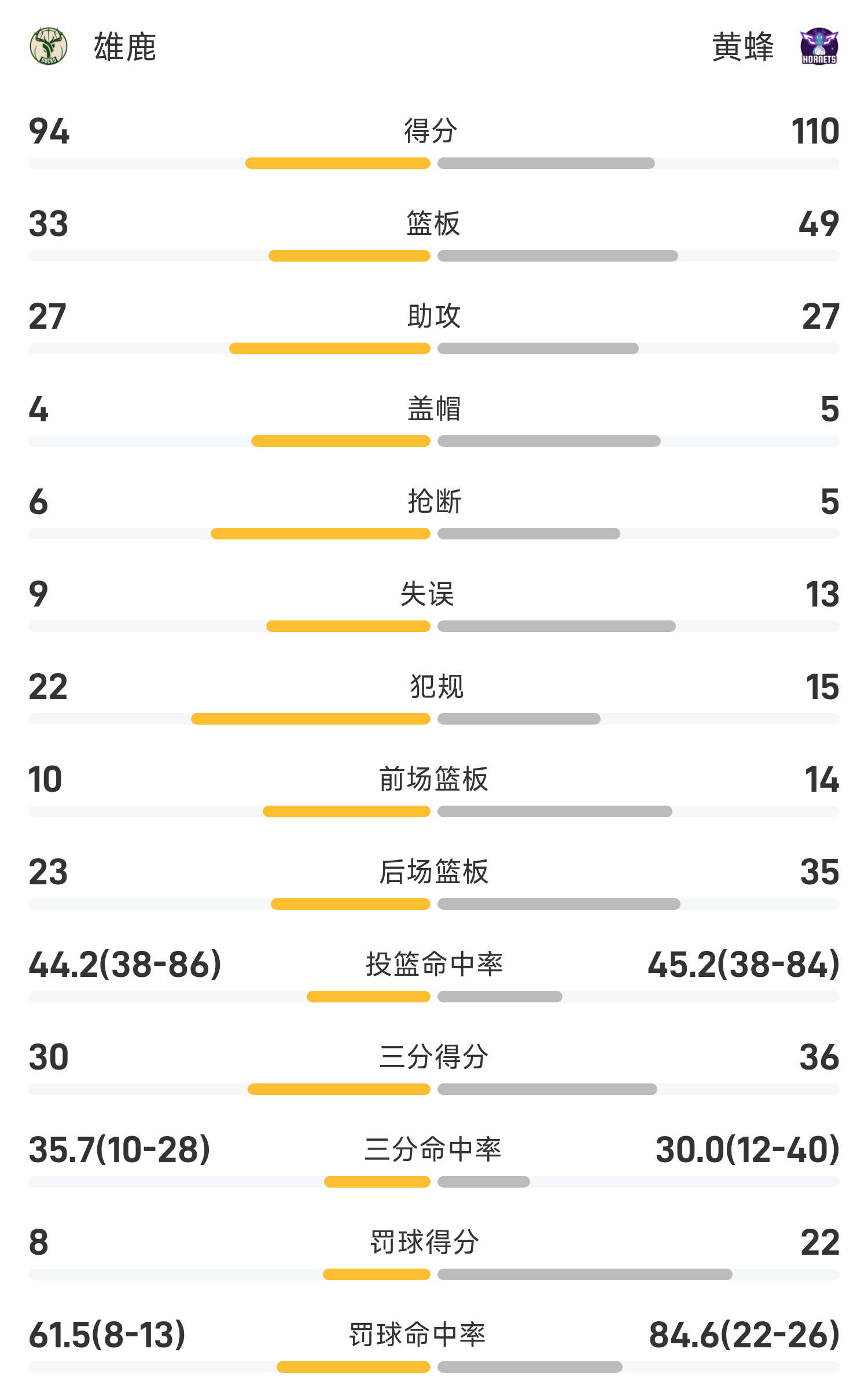 双方全场战罢,黄蜂111-100战胜雄鹿。