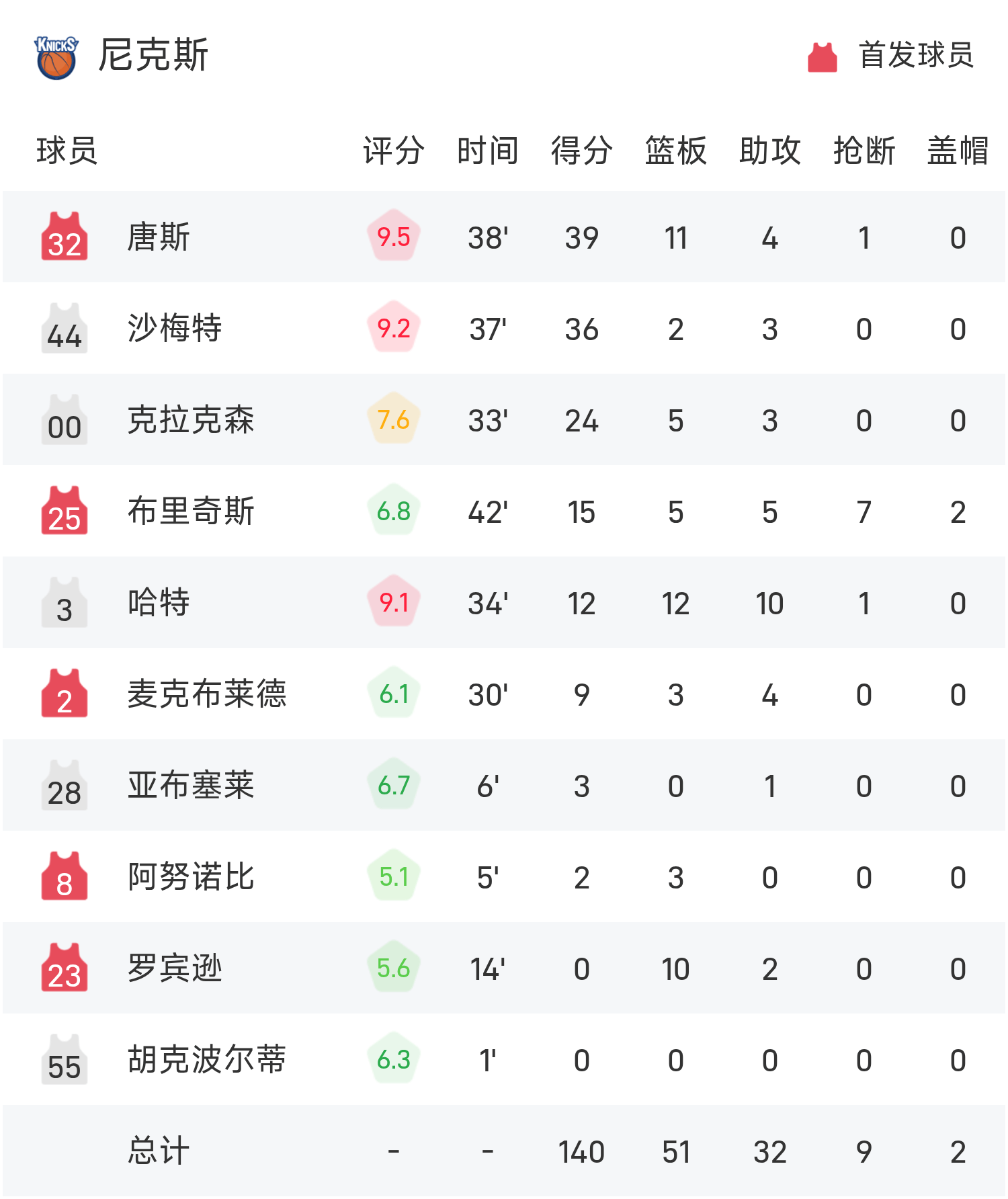 6686体育app11月15日讯 25/26赛季NBA 常规赛 NBA杯分组赛,尼克斯对阵热火。双方全场战罢,尼克斯140-132战胜热火。唐斯砍下全场最高的39分11板4助,率领尼克斯胜利取胜。
