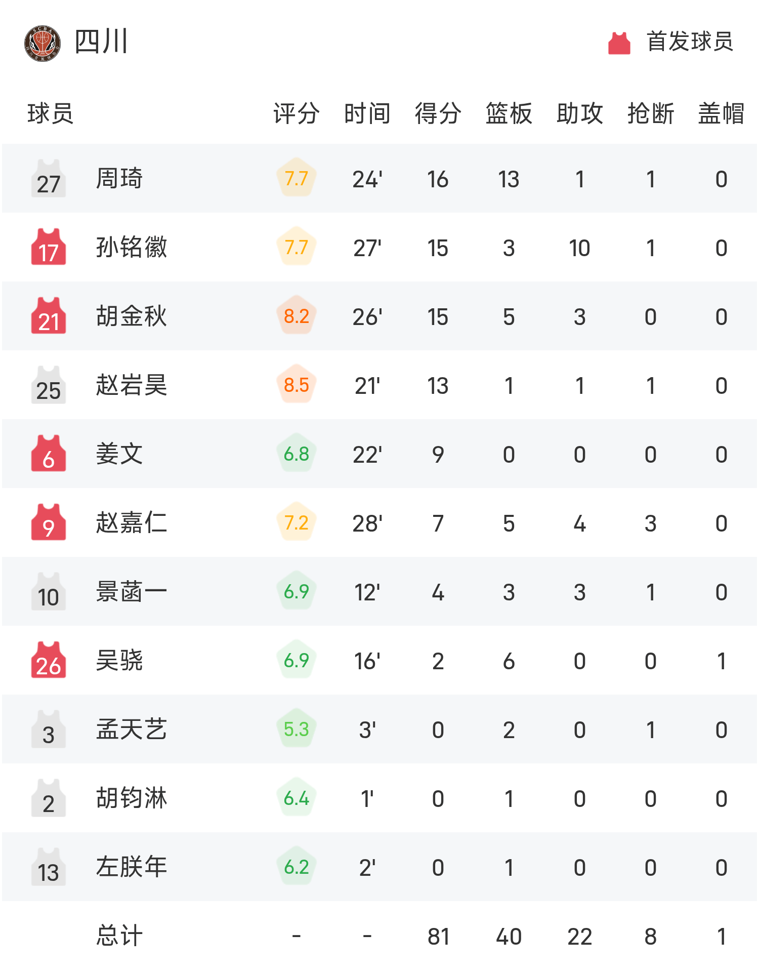 周琦得到16分13板1助率队取胜,俞泽辰空砍全场最高的17分2板,老队员韩德君迎来最后一舞抢下16抢篮板。