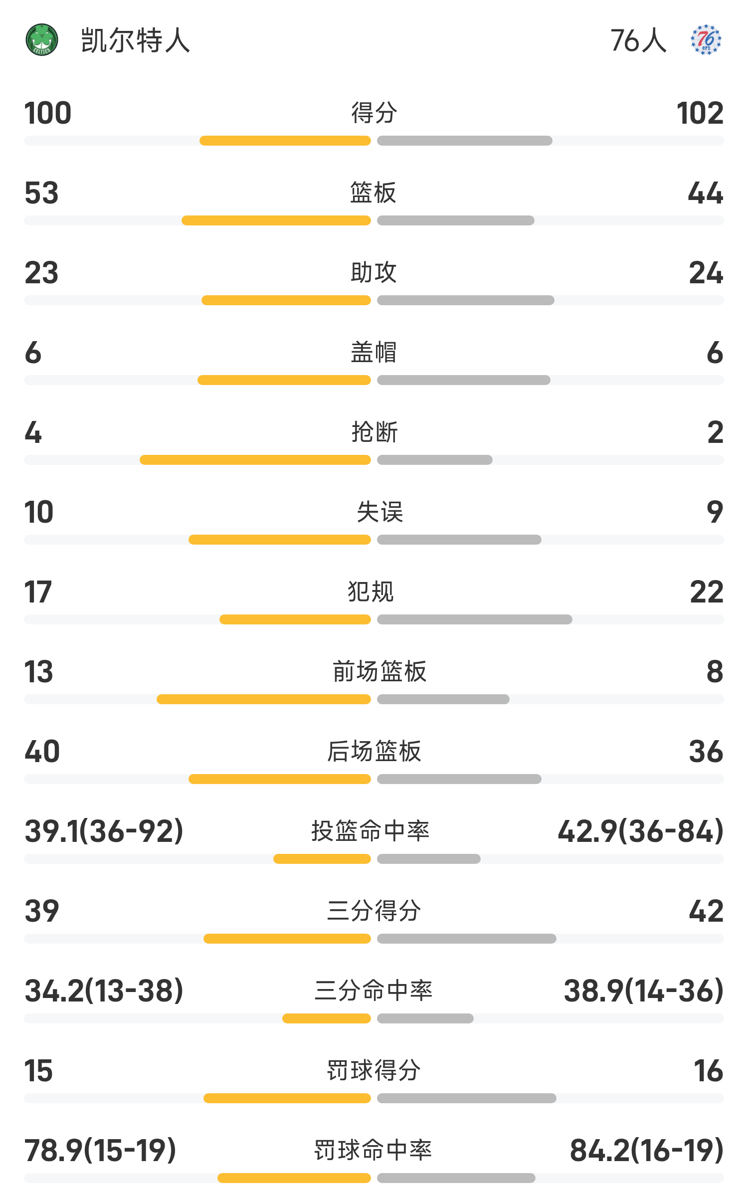 双方全场战罢,76人102-100战胜凯尔特人。