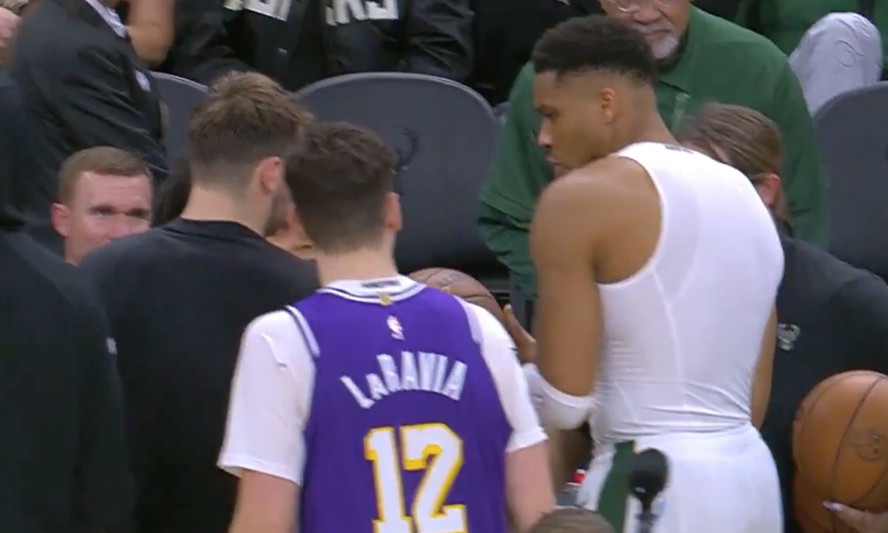 随后,裁判员将竞赛用球给了雄鹿主队场工作人员,湖人球员看到后上前解释想拿走竞赛用球,但雄鹿工作人员依然没有要给的打算,最终还是字母哥看到后,直接走上前来,主动将竞赛用球送给了东契奇,双方互相拍了拍表达友善。