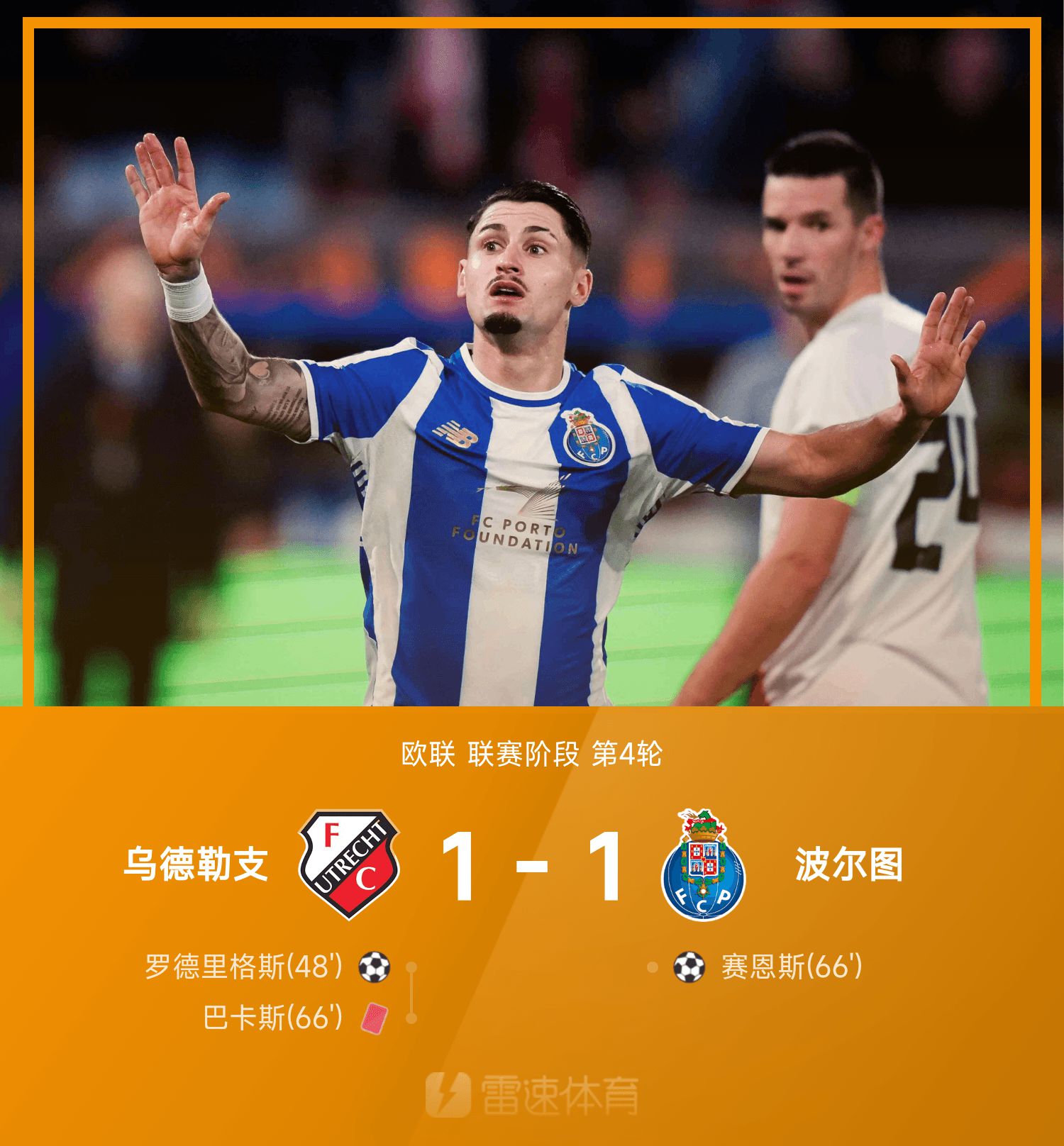 6686体育app11月07日讯 25/26赛季欧联联赛事阶段第4轮,乌德勒支对战波尔图。上半场,双方均无建树。下半场,第48分钟,罗德里格斯建功打破僵局。赛恩斯空门兜射扳平赛果分。期间,乌德勒支守门员巴卡斯与波尔图球员发生争执被罚下牌罚下,乌德勒支以十人应战。最终,十人乌德勒支1-1战平波尔图,双方握手言和,竞赛终结。