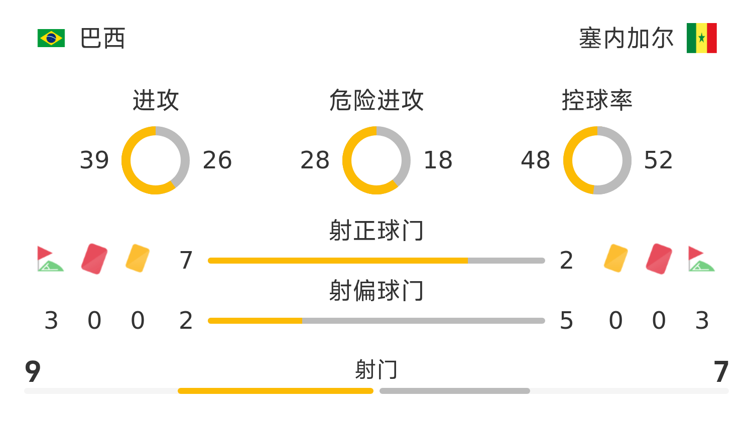 巴西首发阵容:23-埃德森、6-桑德罗、4-马尔基尼奥斯、2-米利唐、3-加布里埃尔、5-卡塞米罗、8-吉马良斯、7-维尼修斯、21-库尼亚、10-罗德里戈、20-埃斯特旺