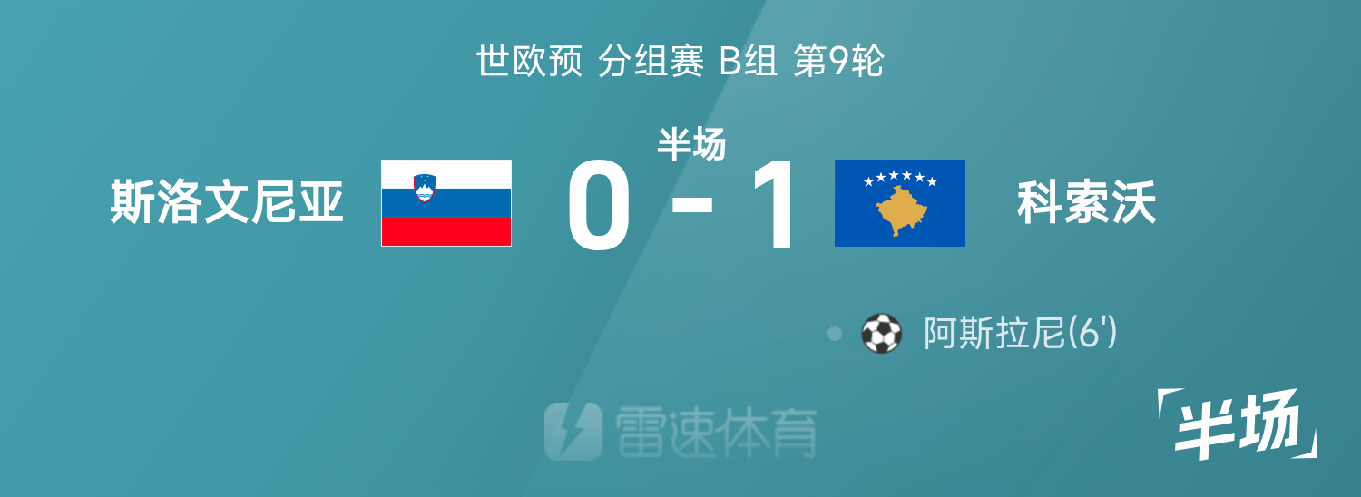世欧预半场:阿斯拉尼戏耍破门,科索沃1-0斯洛文尼亚